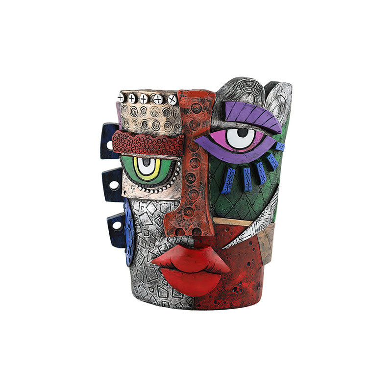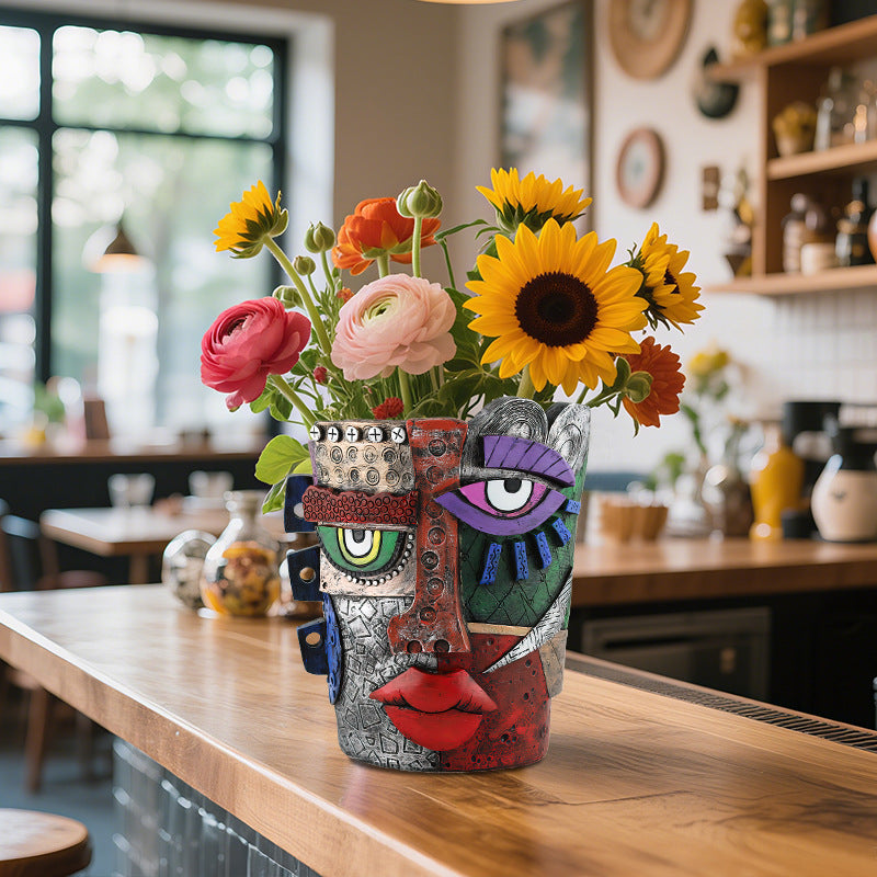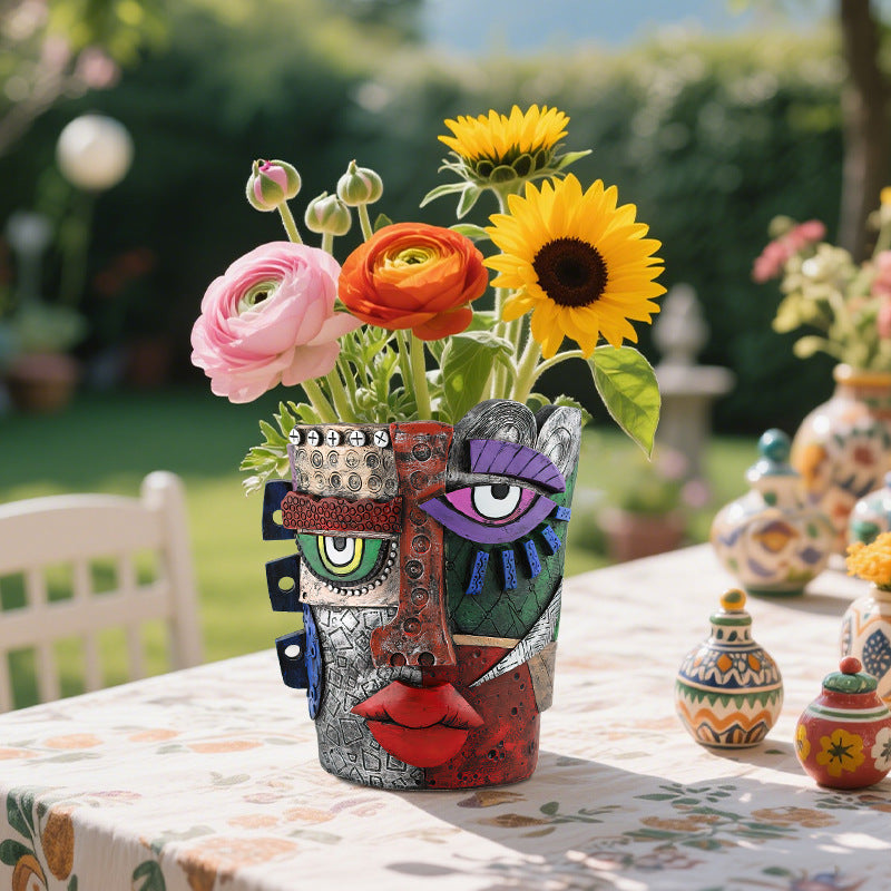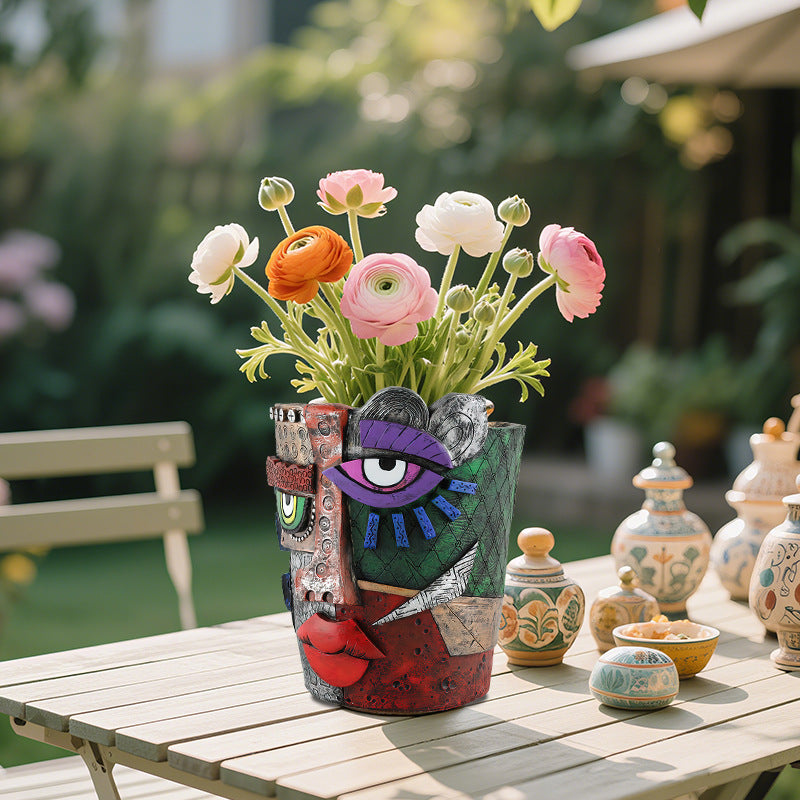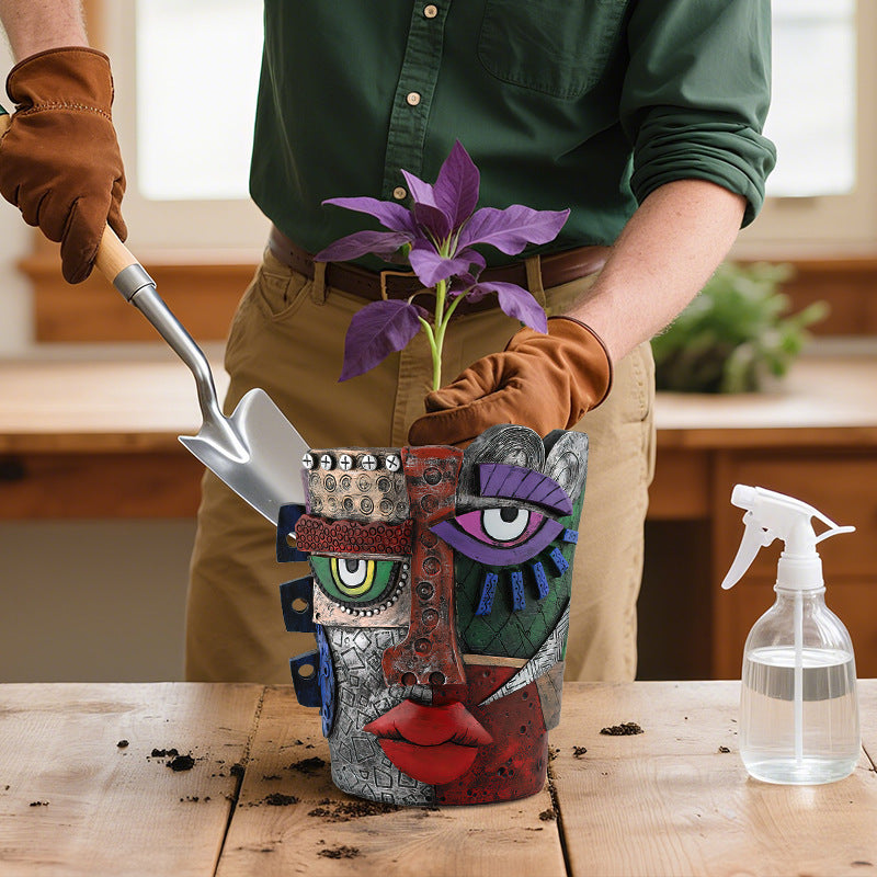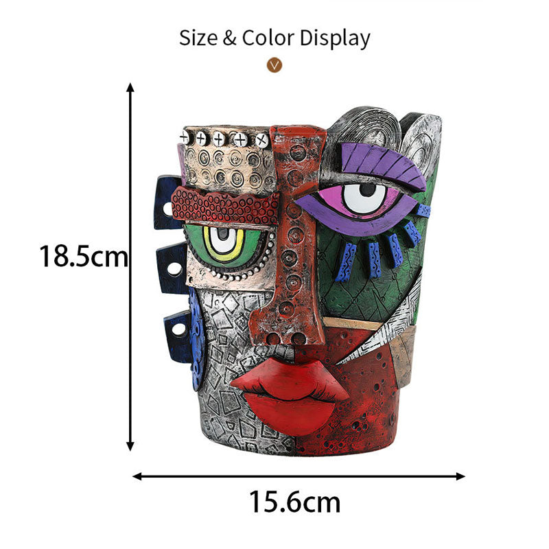 Creative Mayan Abstract Face Flower Pot Resin Ornament, a Personalized Artistic Home and Garden Decor.