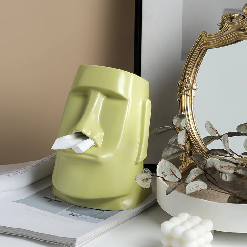 Retro-style, unique design tissue box – a creative decorative item for your living room or coffee table. Made of ceramic with an Easter Island Moai statue design.