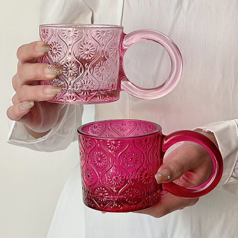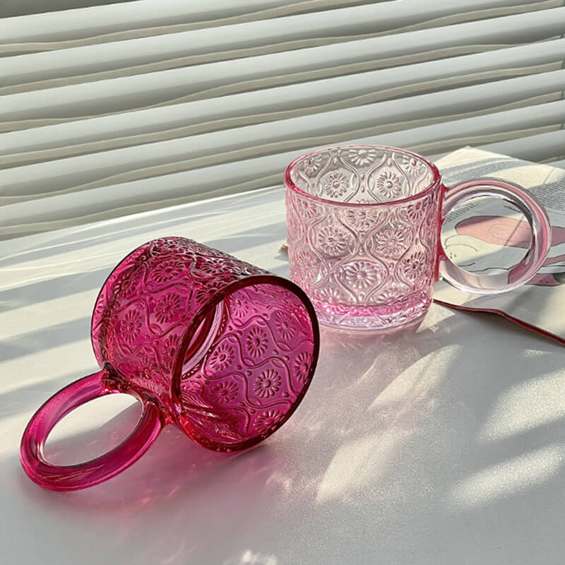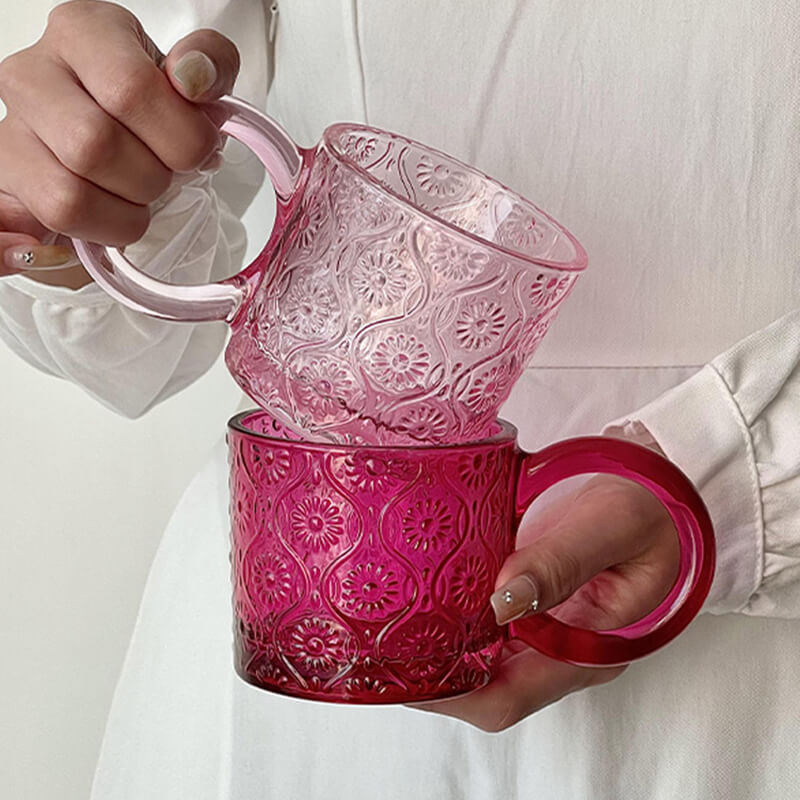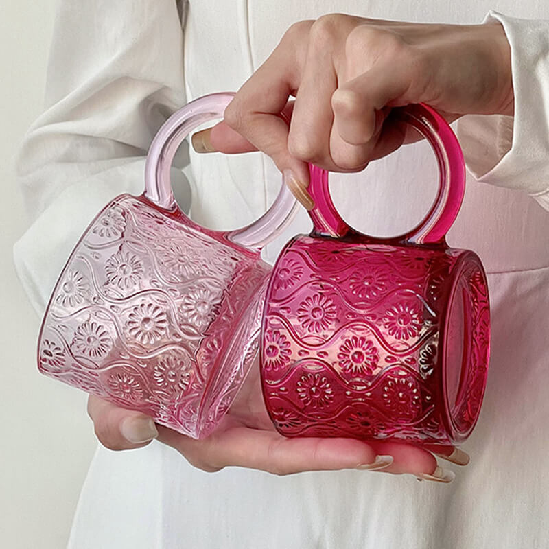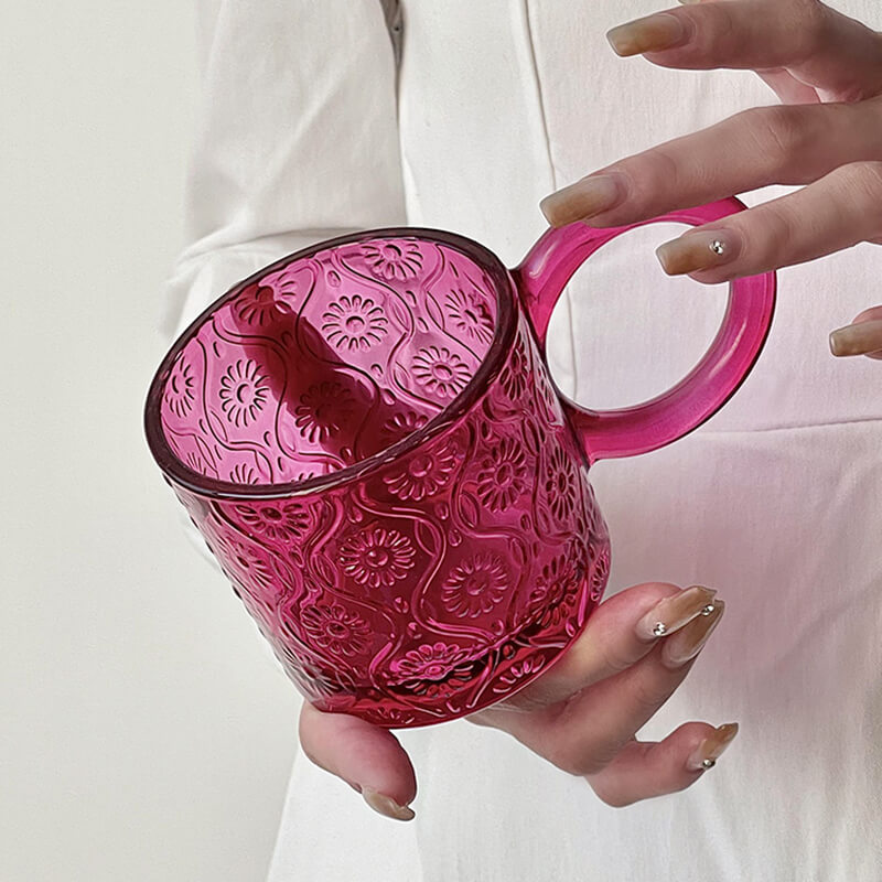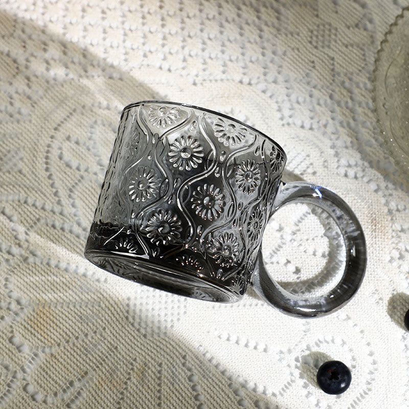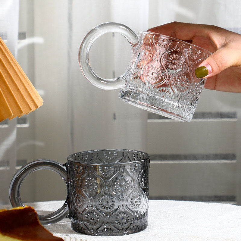 Made from high-borosilicate glass with a beautiful and tactile floral embossed design. This stunning cup adds a touch of vintage charm to any occasion and is both durable and practical. Elevate your drinkware collection with this unique piece today.